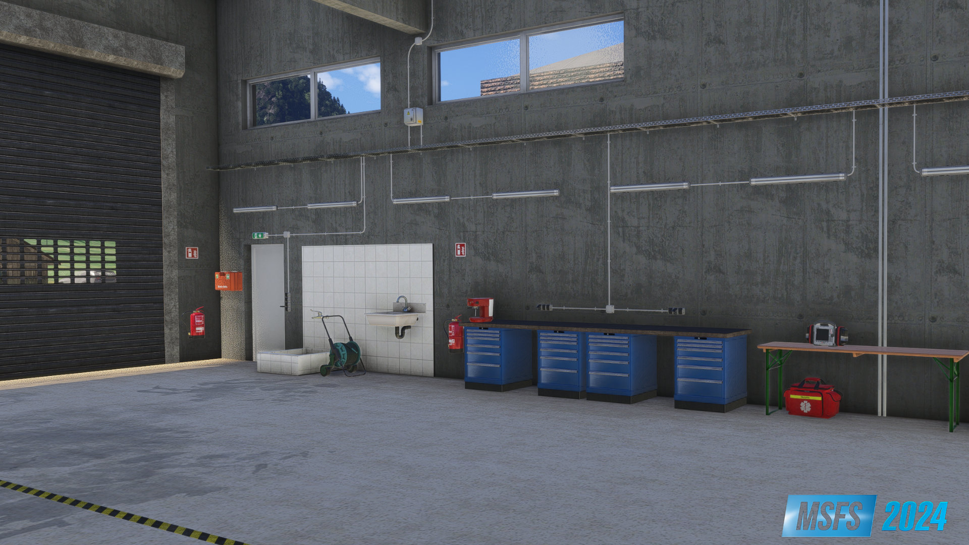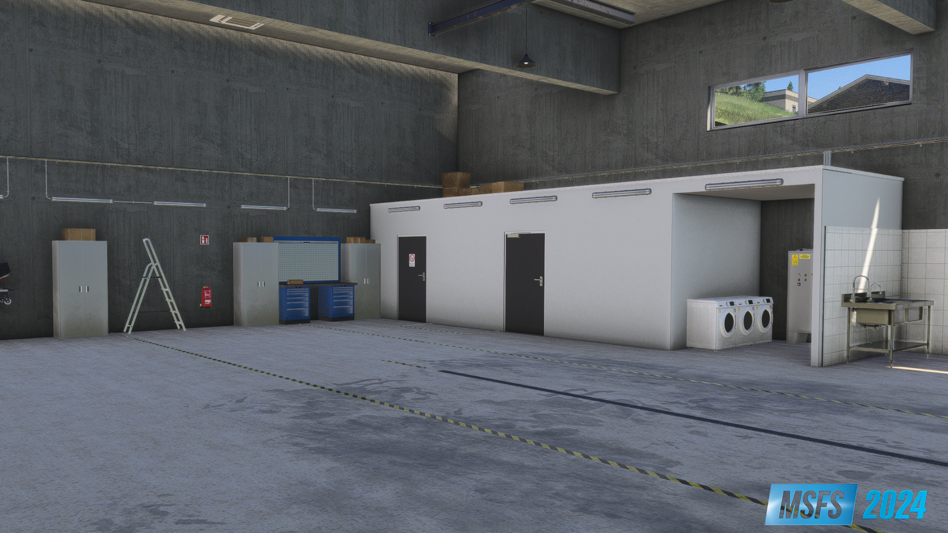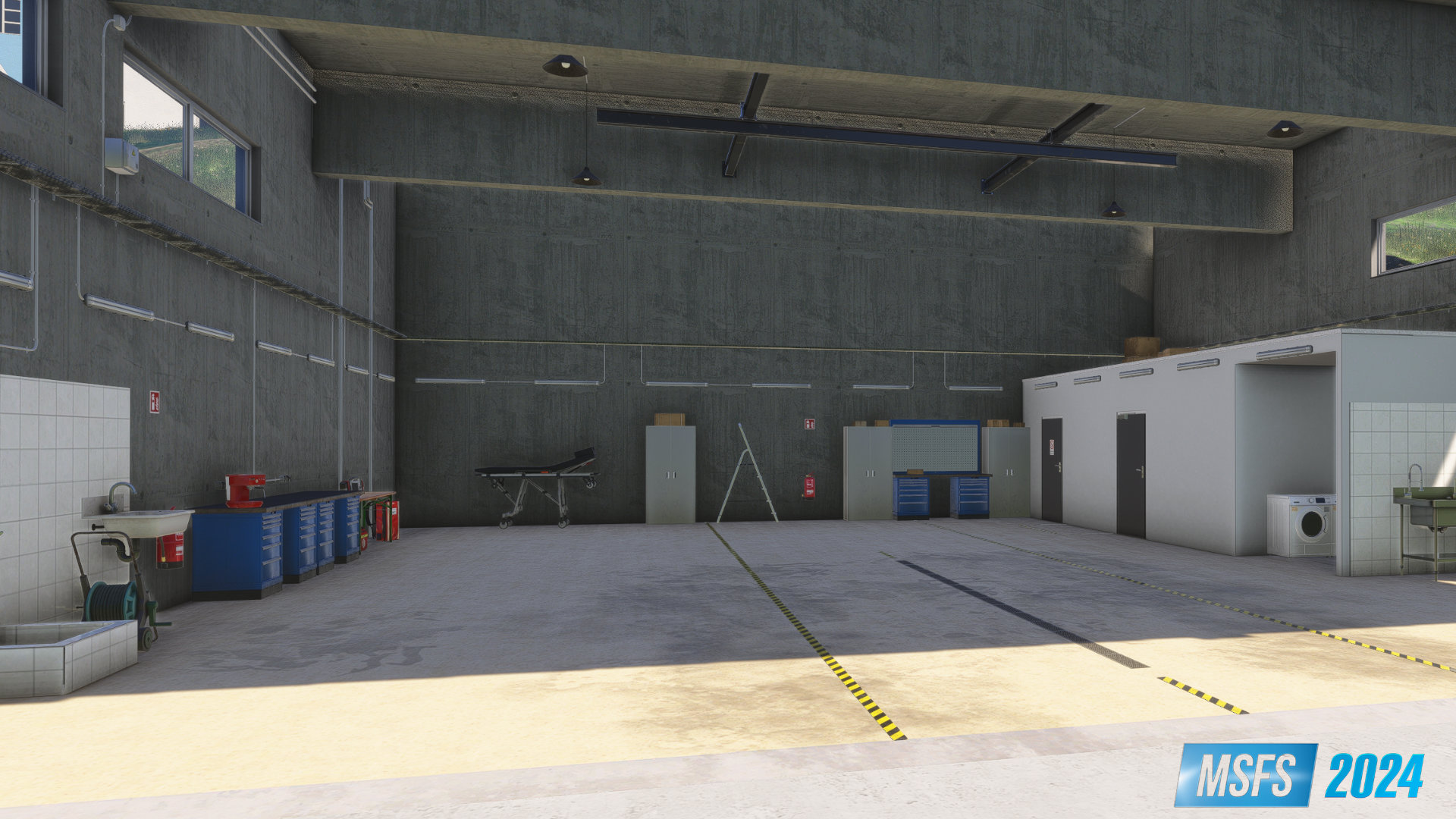 Fully Walkable Interior: Explore a detailed hangar environment on foot.